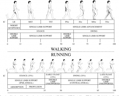 Berjalan akan jatuh tumit dahulu, manakala berlari akan jatuh lebih hadapan, daripada tengah tapak kaki dan akan lebih kehadapan apabila kelajuan meningkat. Bersentuhan dengan tapak sepenuhnya dan tidak memberi impak yang berbeza. Berjalan boleh kata setiap tapak bersentuhan dengan bumi, jadi ia beri impak yang baik kepada ketumpatan tulang, perbaik otot dan fungsi tendon. Ini dikatakan gait mechanism yang baik. Disebabkan itu, mereka yang tak pernah bersenam digalakkan buat brist walk berbanding berlari. Brist walk lebih beri impak positif jika baru mula bersenam.
