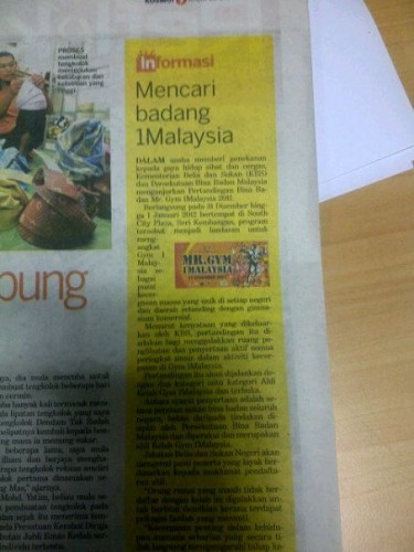 Semua dijemput hadir memberi sokongan kepada atlet-atlet yang bertanding pada pertandingan Mr Gym 1 Malaysia pada 31 Disember 2011 di South City Plaza, Balakong. Pertandingan ini merupakan anjuran Kementerian Belia dan Sukan Malaysia.