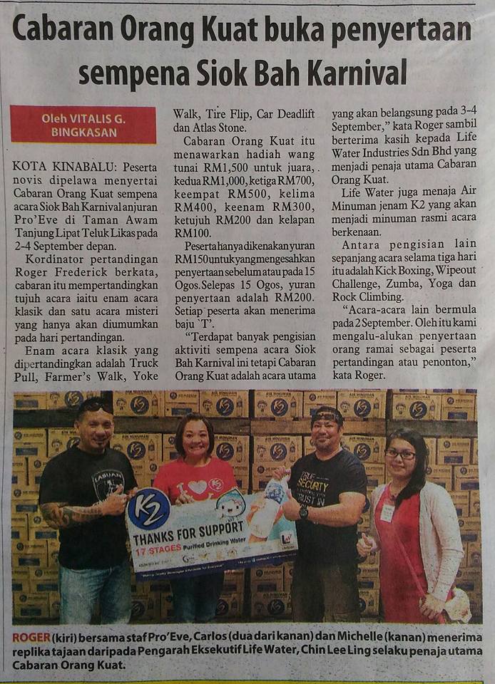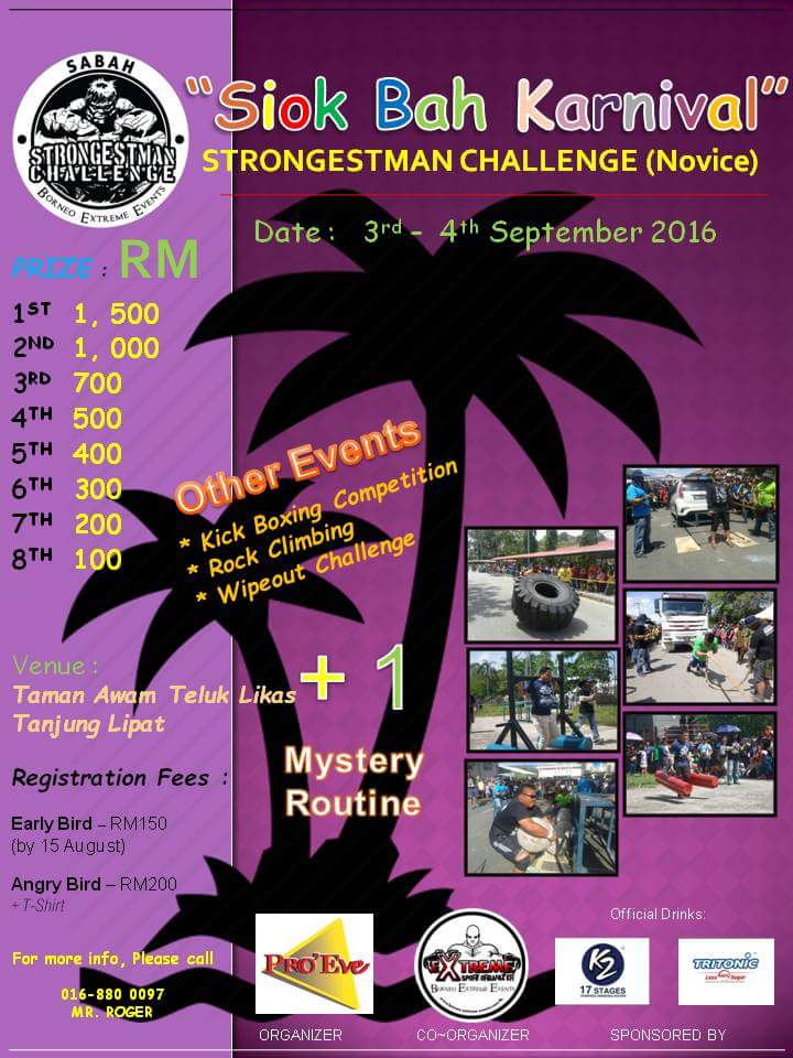 Bagi mereka yang ingin mencuba pertandingan Orang Kuat di Malaysia, boleh ke Kota Kinabalu minggu hadapan. Pertandingan Orang Kuat bakat baru bersempena dengan Siok Bah Karnival di Taman Awam Tanjung Lipat, Teluk Likas, Kota Kinabalu ada diadakan pada 3 dan 4 September 2016. Mereka yang pernah juara tidak dibenarkan masuk.