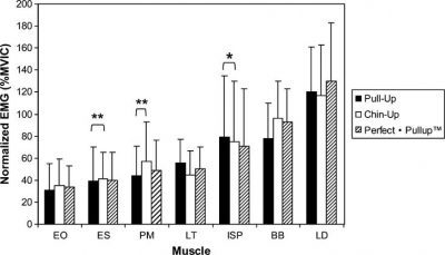 Kedudukan tangan ke luar (pronated) mengurangkan penglibatan bisep. Brachioradialis pula yang bekerja. Otot fleksor tangan ini tidak beri bantuan besar seperti otot bisep dan brachialis. Otot belakang atas (upper back), lattisimus dorsi, trapezius dan rotator cuff juga bekerja dalam pergerakan pull-up.